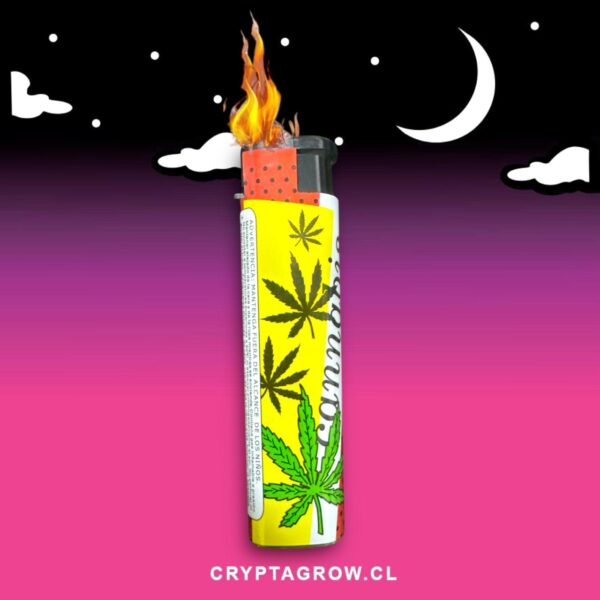 ENCENDEDOR CON LLAMA TIPO SOPLETE, CON DISEÑO DE HOJA AMARILLA FONDO ROJO