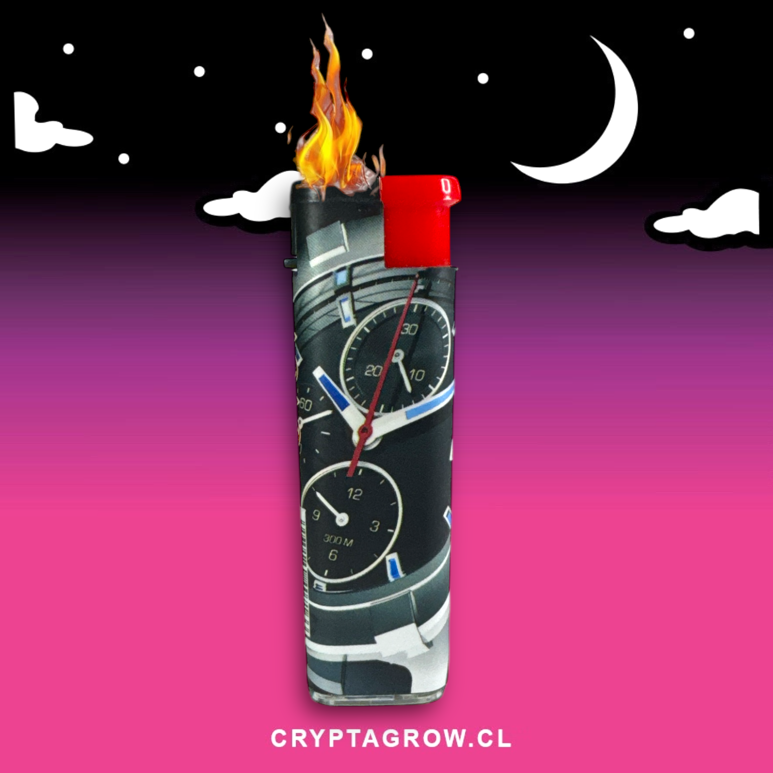 ENCENDEDOR CON LLAMA TIPO SOPLETE, CON DISEÑO DE RELOJ