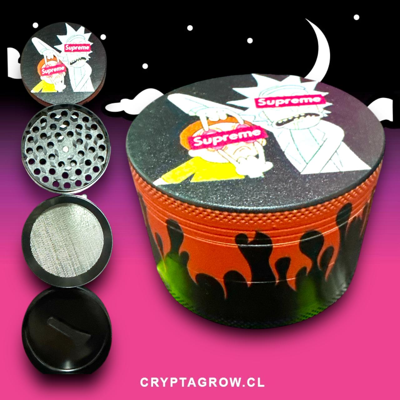 Moledor metálico de 3 niveles con diseño exclusivo de Rick y Morty en versión urbana estilo Supreme. Incluye compartimiento con malla para polvillo y palita para recoger el kief.