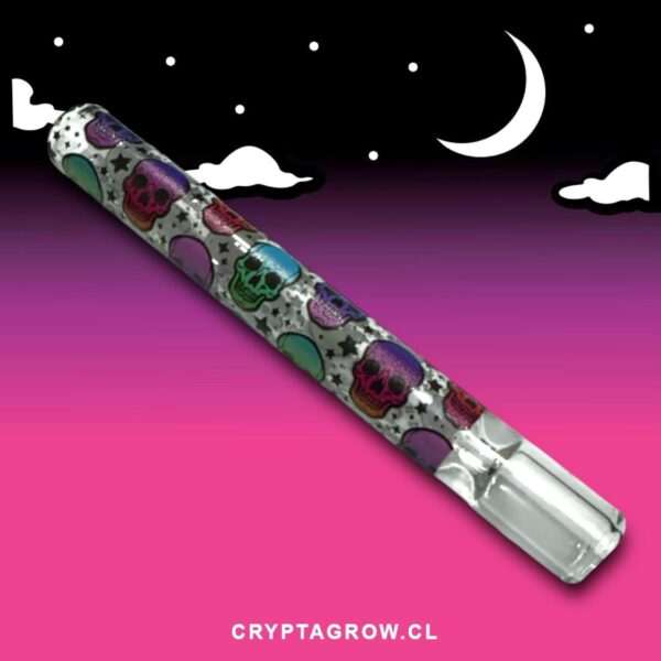 Pipa Hitter Calaveras: vidrio 100 % transparente con estampado de calaveras vibrantes y dise帽o ergon贸mico para fumadas directas y sin complicaciones.